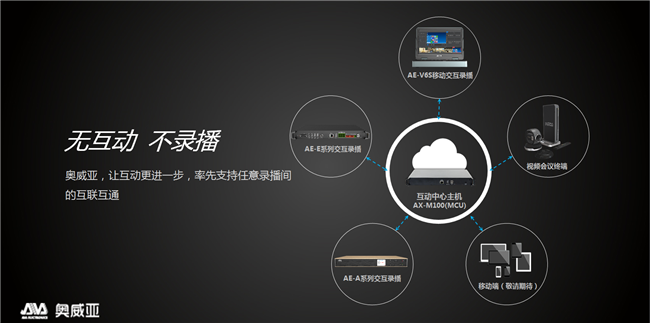 如今,奧威亞的任意系列錄播設備均可實現互動,同時我們只需添加奧威亞自主研發的MCU互動中心主機,即可實現第三方視頻會議終端、任意品牌錄播設備之間有效的互聯互通。真正打破了錄播互動原有的技術界限!