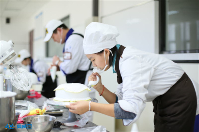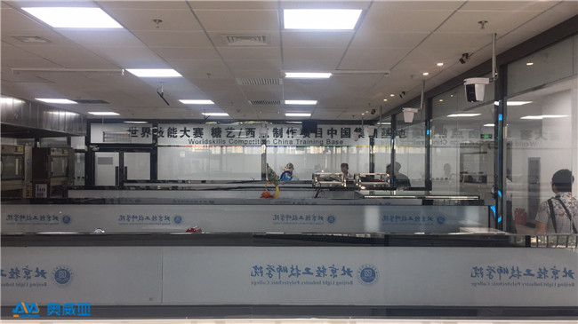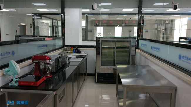 其實,用于比賽的糖藝西點實訓室只是北京輕工技師學院門頭溝教學區眾多實訓室的其中一間。門頭溝教學區是華北地區規模最大的西點西餐培訓基地,建有21間教、學、做一體化實訓教室,包括食品烘焙實訓室、西餐實訓室、裱花實訓室、咖啡實訓室、翻糖實訓室等等,其中有18間是奧威亞為該教學區量身打造完成的。