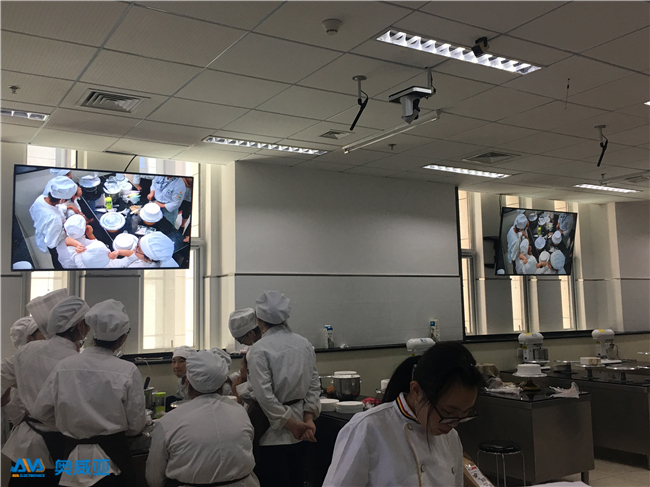 實訓基地主要供學生學習、訓練西點西餐制作技能使用。老師只需站在帶有奧威亞全高清云臺攝像機的工位上進行示范操作,學生們就可以通過課室里的高清大屏方便地觀看與學習,而不需要里三層外三層地圍著老師。這種做法,避免了傳統實訓中因場地、人數等限制因素而產生的教學質量下降的問題。