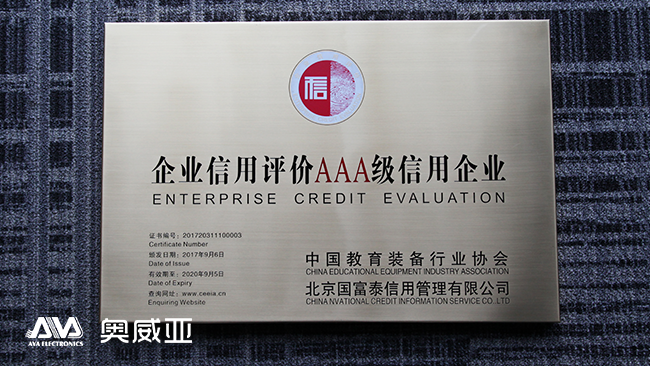 企業信用評價,是指信用評級機構在嚴密分析的基礎上,根據行政法規、企業經營情況、財務能力等因素進行綜合考核,對企業信用程度進行劃等級。信用等級普遍采用國際通行的"四等十級制",具體分為:AAA,AA,A,BBB,BB,B,CCC,CC,C,D。奧威亞經過層層考核、評估,最終以良好的經營狀況和信譽度,榮獲教育裝備行業AAA級的企業信用證書。