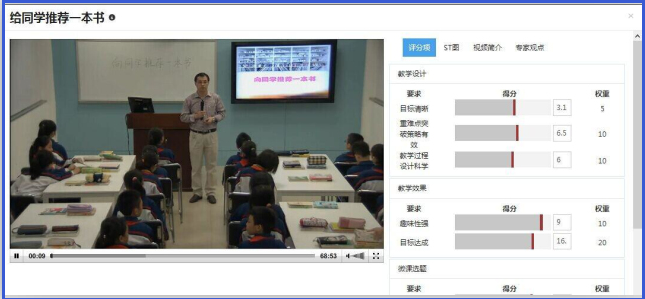 評課過程中,教研人員可直接在視頻觀看頁面瀏覽優(yōu)課資源的全部內(nèi)容,篩選出符合政策標(biāo)準(zhǔn)的優(yōu)課,完成評課的初選。初選結(jié)束后,學(xué)科專家可進(jìn)入個(gè)人空間點(diǎn)擊“教研工作室”的評課活動(dòng)管理查看個(gè)人的評審任務(wù),再根據(jù)列表點(diǎn)擊優(yōu)課視頻進(jìn)行考察。只需要通過簡單的鼠標(biāo)拖拽操作即可對視頻進(jìn)行打分,也可以在“專家觀點(diǎn)”里通過語音識別功能留下文字評論,完成評課工作。